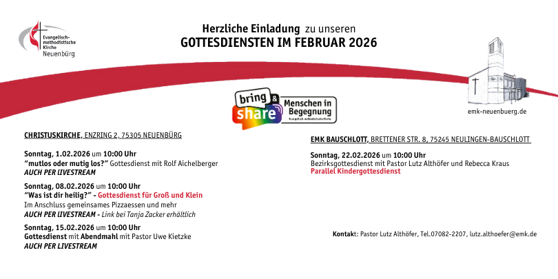 Unseren Gottesdienst feiern am Sonntag, um 10 Uhr, in den barrierefreien Gemeinderäumen im Enzring 2. Gleichzeit übertragen wir in der Regel per Livestream diese Gottesdienste über unseren YouTube-Kanal.