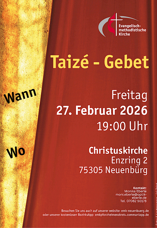 Herzliche Einladung zum Taizé-Gebet Am Freitag, 27. Februar 2026 um 19 Uhr feiern wir zum Ausklang der Woche ein Taizé-Gebet. Lieder aus Taizé, Gebete, und...