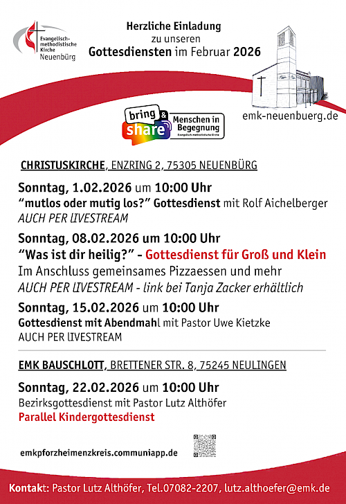 Herzliche Einladung zum Mitfeiern! Herzlich möchten wir Sie zu den Gottesdiensten im Februar einladen. Wir feiern sie mal in der Christuskirche, Enzring 2,...