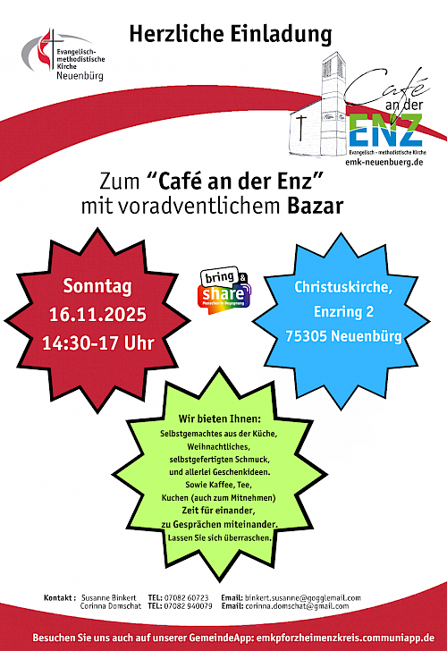 Herzlich willkommen zu unserem Café an der Enz, mit dem wir von Zeit zu Zeit am Sonntagnachmittag im Städtle ein Angebot zum Verweilen und zwanglosen...