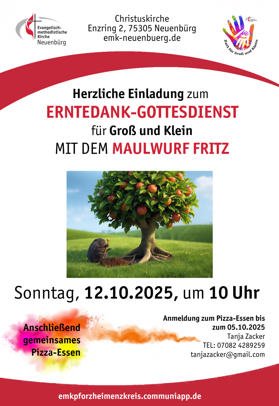 Wir laden Sie herzlich ein mit uns am Sonntag, 12. Oktober 2025 um 10 Uhr in der Christuskirche, Enzring 2, 75305 Neuenbürg Erntedank zu feiern und anschließend die Gemeinschaft beim Pizza-Essen weiter zu genießen.