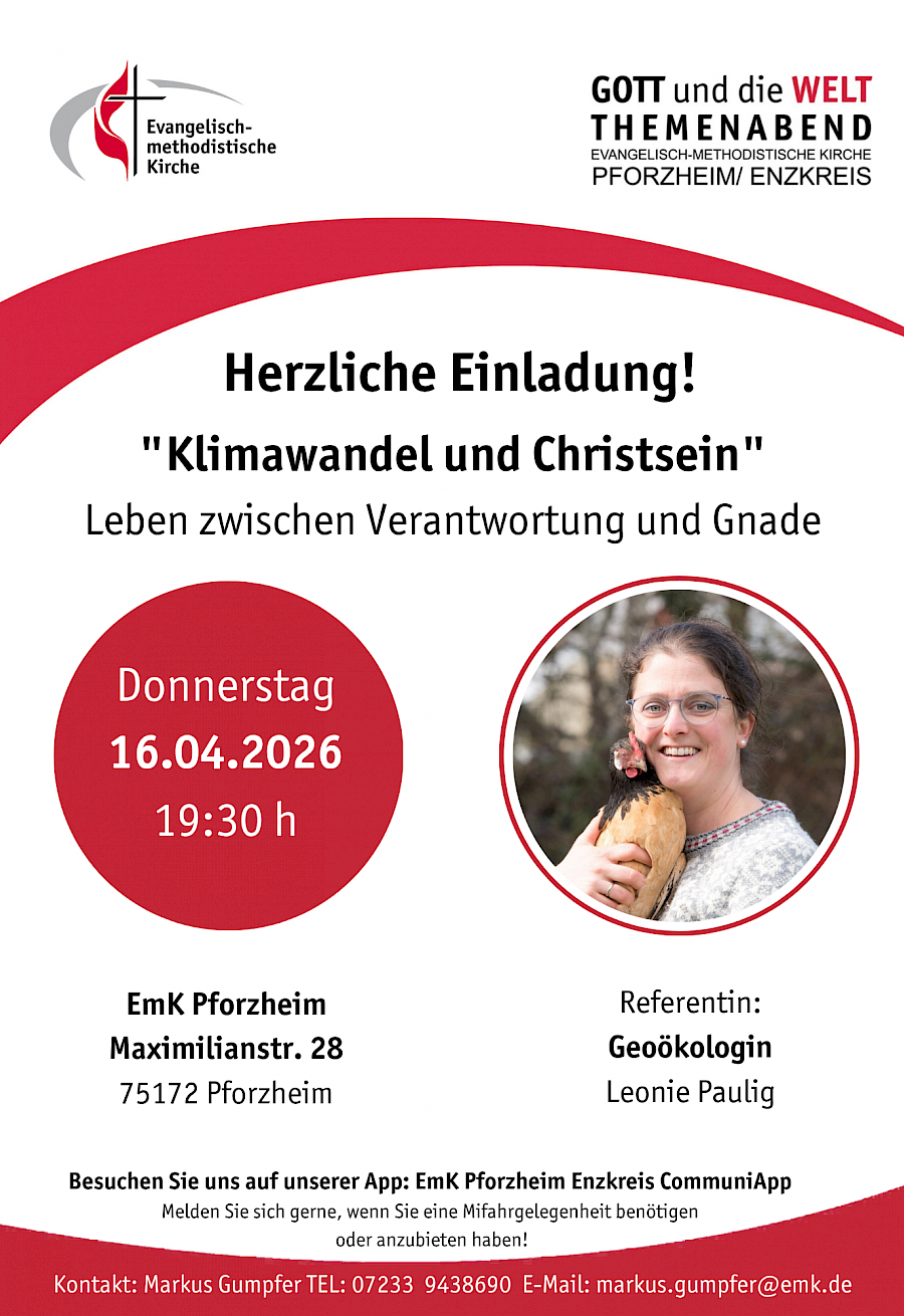 Die Reihe „GOTT und die WELT Themenabend“ wird von den fünf Evangelisch-methodistischen Gemeinden des Bezirks Pforzheim/ Enzkreis gestaltet. Mit kompetenten Referenten wollen wir zu den unterschiedlichen Themen ins Gespräch kommen.