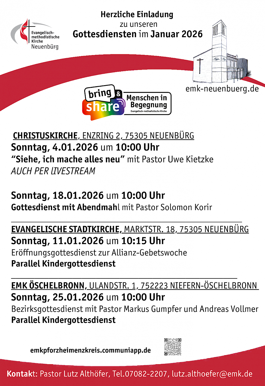 Herzlich möchten wir Sie zu den Gottesdiensten im Januar 2026 einladen. Wir feiern sie mal in der Christuskirche, mal mit den Geschwistern der Evangelischen Allianz, sowie gemeinsam mit dem Bezirk Pforzheim/Enzkreis.