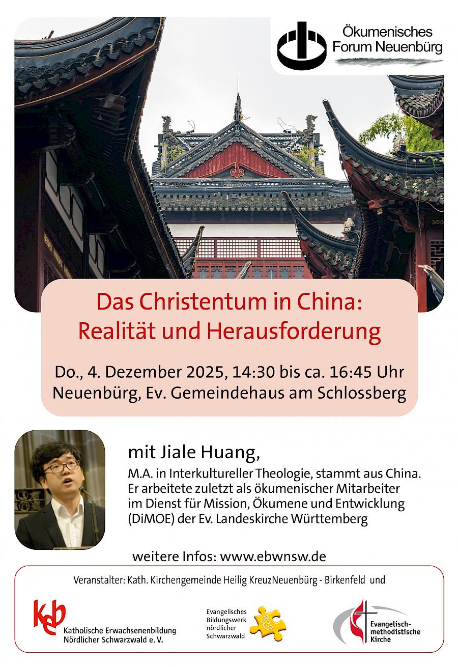 Herzlich Willkommen Donnerstag, 04. Dezember 2025, 14.30 Uhr – ca. 16.45 Uhr im Ev. Gemeindehaus am Schlossberg, Burgstr. 1, Neuenbürg mit Jiale Huang, M.A. in Interkultureller Theologie, stammt aus China. Er arbeitete zuletzt vier Jahre ökumenischer Mitarbeiter im Dienst für Mission, Ökumene und Entwicklung (DiMOE) der Evangelischen Landeskirche in Württemberg.