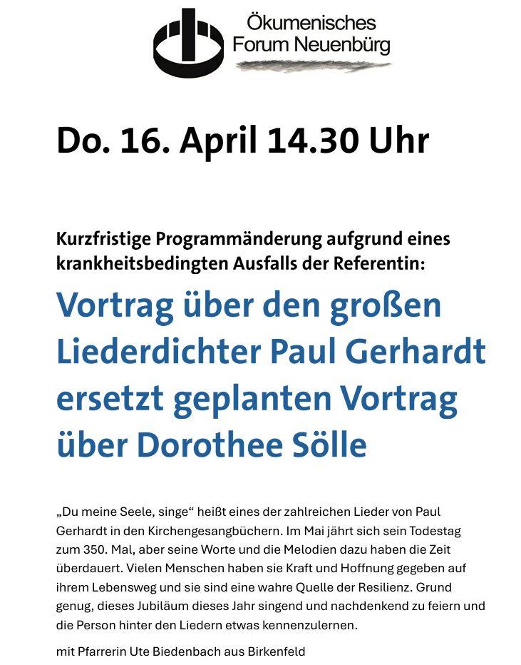 Vortrag über den großen Liederdichter Paul Gerhardt ersetzt den geplanten Vortrag über Dorothee Sölle.