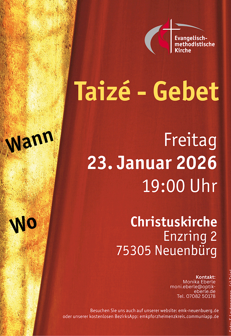 Lieder aus Taizé, Gebete, und Zeiten der Stille möchten uns aus der Unruhe des Alltags in die Ruhe, in eine Zeit der Besinnung und der Begegnung mit Gott führen.